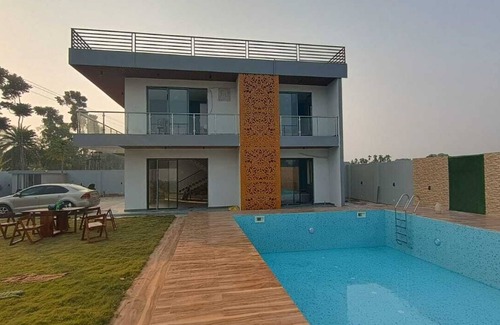 Escape to our Earth Villa with a grand pool, nestled in nature's heart. Fully furnished 4 pool-facing rooms and a with 6 washrooms, security ensures peace. Enjoy a spacious lawn. At the end of the day, retreat to the comfort of your Earth Villa and bask in the tranquility of your surroundings. Whether you're seeking a romantic getaway, a family vacation, offers the perfect blend of luxury, comfort, and natural beauty. Book your stay today and experience the magic of our Earth Villa for yourself.